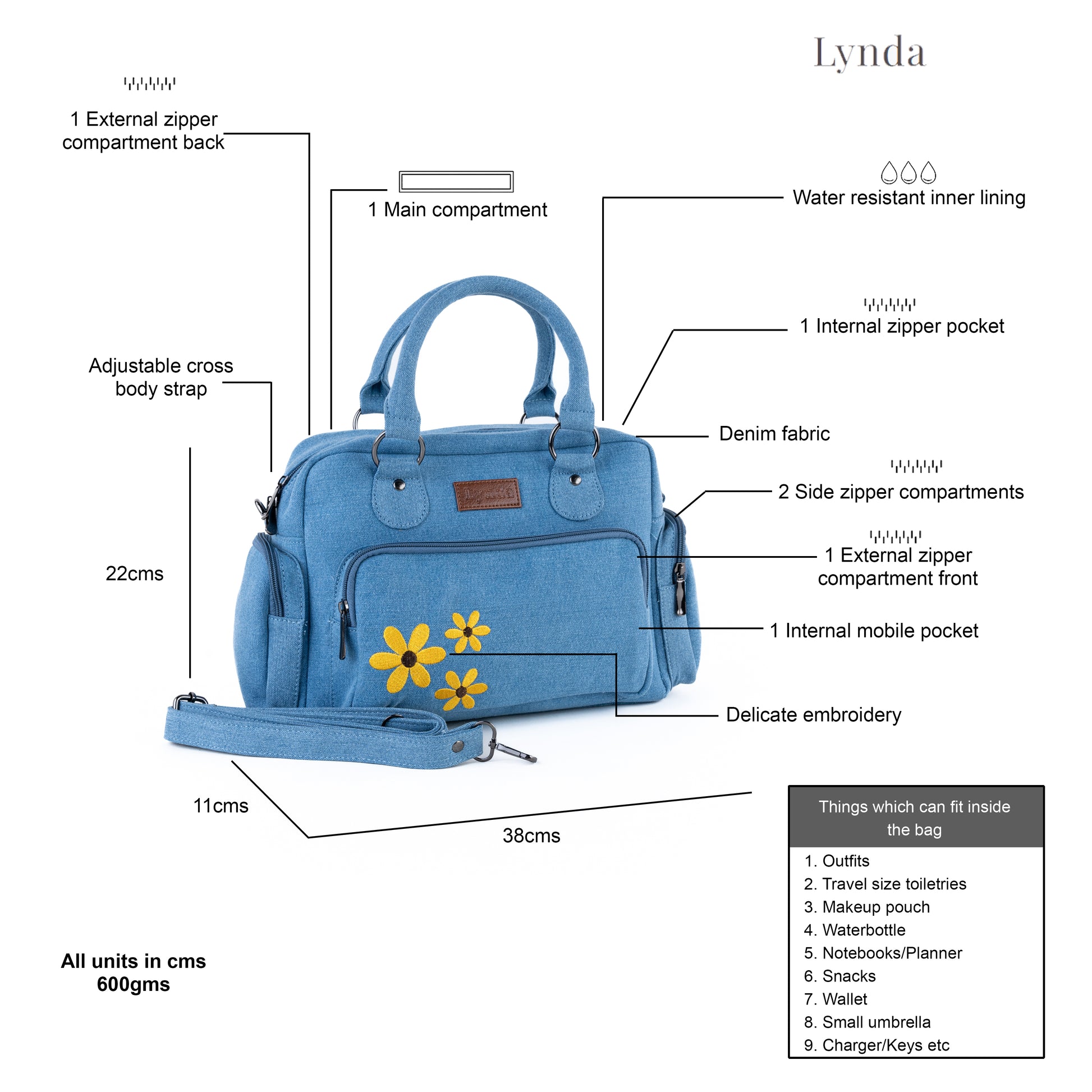 Measurements (in cms) : 38 cm (L), 22 cms (H), 11 cms (W)