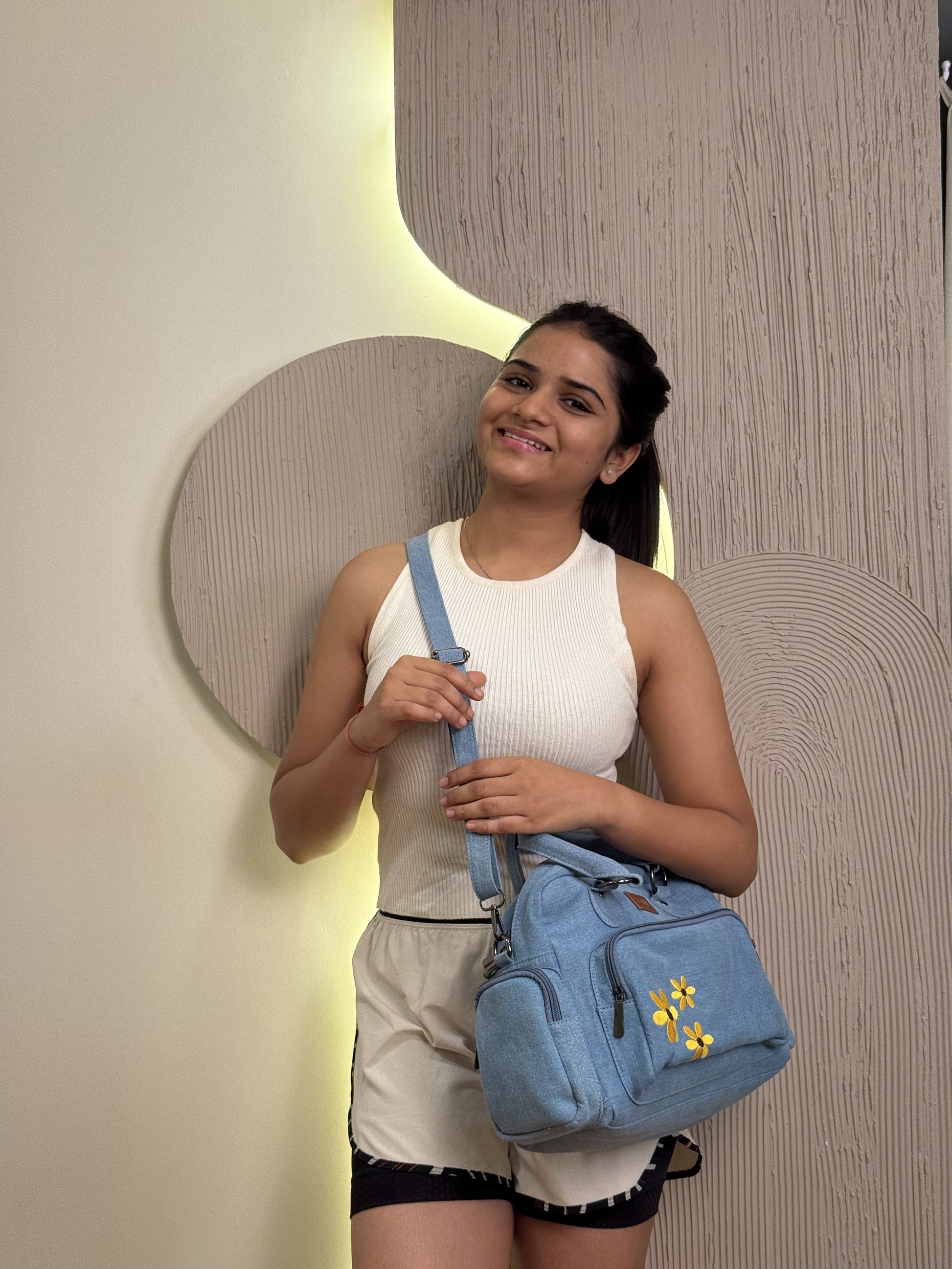 Soft blue denim, cheerful embroidered flowers, and space for all your everyday must-haves - the Bloom Buddies Duffle brings a fresh, fun twist to your daily carry. Practical, pretty, and full of personality.