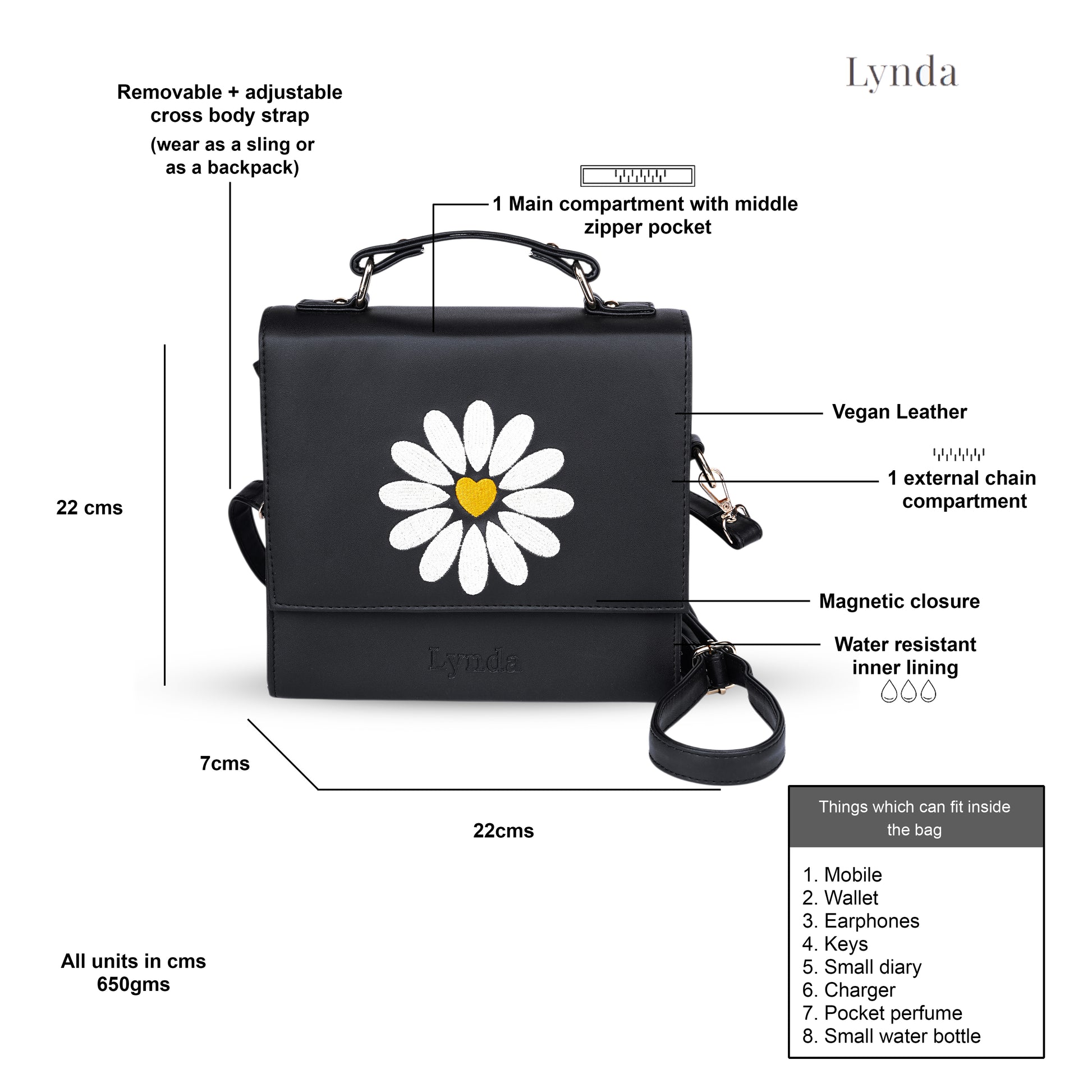 The Sunnyside embroidery bag is a compact 2-in-1 design that can be used both as a sling bag and a backpack.